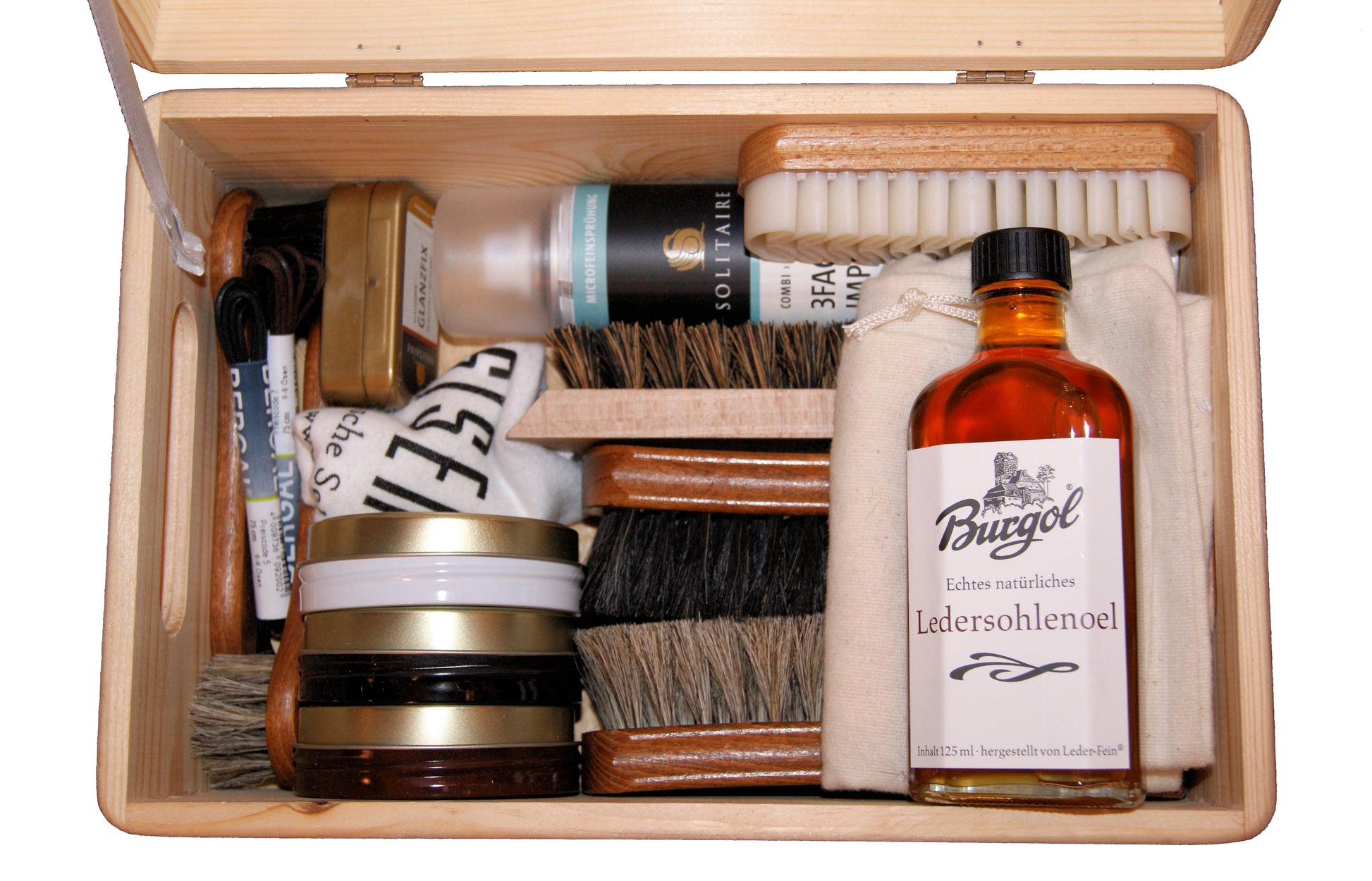 Praktischer Schuhputzkasten aus Kiefernholz, befüllt mit 16 hochwertigen Produkten der Premium-Schuhpflegemarken BURGOL und SOLITAIRE. Perfekt als Geschenk für den qualitätsbewussten Schuhliebhaber!